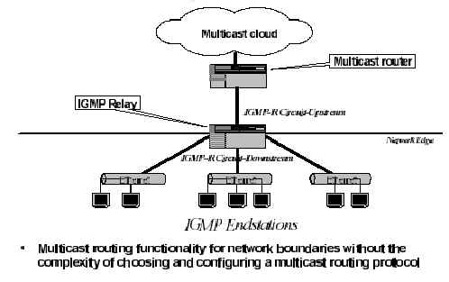 Um dispositivo que implementa IGMP-R representa as estações finais nas fronteiras da rede. O dispositivo IGMP-R se comporta logicamente como um host conectado diretamente a um dispositivo que efetivamente executa um protocolo de roteamento multicast. Ele é usado para repassar informações de grupo e encaminhar pacotes multicast entre o roteador e as estações finais.
