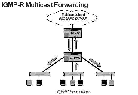 O dispositivo IGMP-R não executa protocolos de roteamento multicast, o que permite que seja implementado em estações PC de baixo custo.