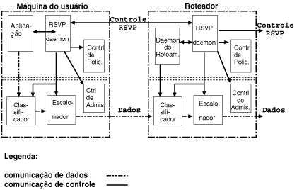 Vejamos um cenário simples, ponto-a-ponto, em que todos os elementos compreendam o protocolo RSVP. Em cada nó roteador, além do gerenciador de recursos, responsável pela reserva, existem módulos de controle de tráfego e policiamento que auxiliam o RSVP na tarefa de reservar os recursos requisitados, baseados no esquema da figura 1. Como pré-requisito, uma sessão RSVP deverá ser instalada.