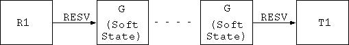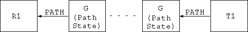 Seja T1 uma máquina que contém uma aplicação que tenha requisitos de QoS, R1 outra máquina que receberá dados dessa aplicação e G roteadores intermediários. A aplicação em T1, para iniciar sua transmissão, envia uma mensagem de controle chamada de mensagem de caminho (ou path message ou PATH), que seguirá seu caminho, pelos diversos roteadores até chegar em R1, conforme figura 3. A mensagem PATH contém um cabeçalho RSVP e todas as informações sobre o tráfego que a aplicação em T1 espera gerar, i.e, valores para os parâmetros de QoS. A cada roteador G existente entre T1 e R1, será criado um estado chamado de PATH state.