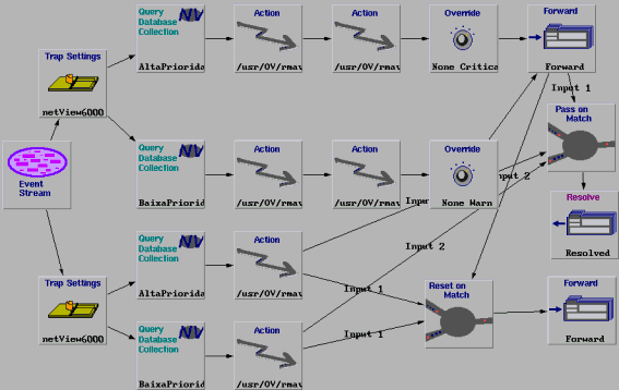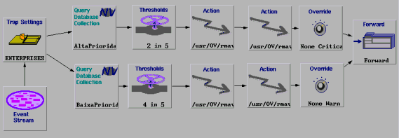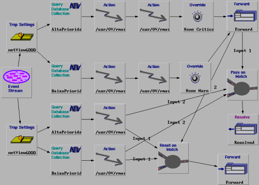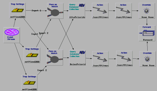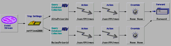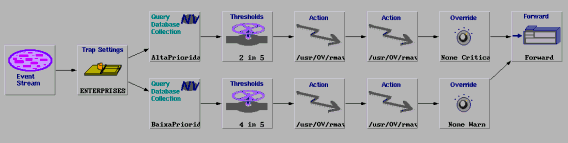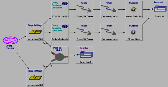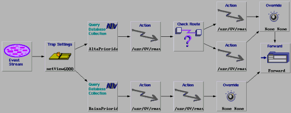 Na seqüência do evento start, é verificado se este evento se refere ao nó gerenciado de alta ou baixa prioridade pelos nodes Query Collection. Para cada uma destas prioridades existe um procedimento de diagnóstico e um procedimento reativo representado pelos nodes Actions. Em seguida a severidade do evento pode ser alterada pelos nodes Override e o evento é enviado para a janela de eventos ou Workplace. No caso do NetView, é exibido de acordo com a nova severidade, indicada por uma cor adequada.