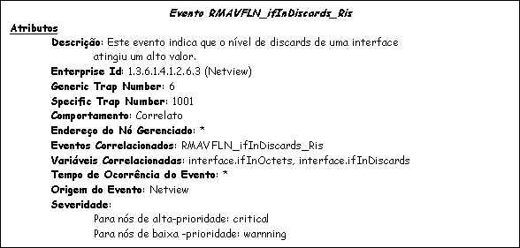 - Evento RMAVFLN_ifInDiscards_Ris: evento configurado no NetView e indica que, durante a coleta feita em uma interface, esta atingiu um nível de descartes elevado.