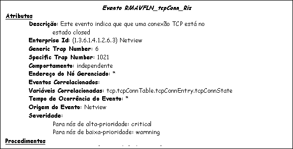 - Evento RMAVFLN_tcpConn_Ris : evento configurado no NetView e indica que, durante a coleta feita no estado de um connexão TCP, esta ficou no estado closed. Este evento pode ser utilizado para monitorar a disponibilidade de um daemon TCP, por exemplo.