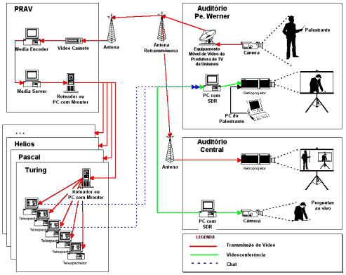 - Uma câmera analógica responsável por filmar perguntas e/ou comentários realizados por uma platéia remota (auditório central da Unisinos), ligada em uma máquina Pentium II 400MHz com placa de captura de vídeo (BT848), a qual transmitia as perguntas através de videoconferência para o auditório Pe. Werner, onde se encontrava o palestrante (software VIC e RAT);