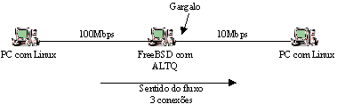 - Qualidade de serviço: fazer com que as aplicações mais críticas tenham preferência sobre as outras nos equipamentos da rede, como por exemplo, fazer com que o áudio e o vídeo tenham preferência na transmissão de dados em relação a mensagens de correio eletrônico e download de arquivos na Internet (que podem esperar sem maiores problemas). Atualmente existe uma linha de pesquisa no PRAV visando inserir qualidade de serviço em determinadas aplicações. Já foi feito um teste com políticas de fila após um curso realizado na FAPESP [1]. O teste efetuado envolveu instalar ALTQ com CBQ e RED num FreeBSD funcionando como roteador, com uma placa de rede a 10Mbps e uma a 100Mbps, a fim de gerar um gargalo [4]. Duas máquinas linux, uma em cada lado do roteador, se conversarem através de 3 conexões TTCP, cada uma com uma política de prioridade diferente, como mostra a figura 13. O sistema funcionou, privilegiando a conexão com a maior prioridade, mas ainda se está no início dos trabalhos nessa linha.