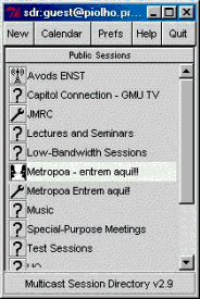 Com o túnel ativado, basta um cliente entrar no SDR para que apareçam as sessões multicast que estão sendo anunciadas no momento, conforme mostra a figura 8. No caso, todos os participantes da videoconferência escolheram a sessão "Metropoa - entrem aqui!!!", que foi previamente criada numa máquina com FreeBSD na Unisinos.