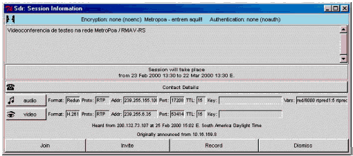 Ao escolher a sessão da videoconferência, como mostra a figura 9, pode-se ver que o protocolo de compressão de vídeo foi o H.261, que será utilizado pelo VIC no endereço multicast 239.255.155.106. Similarmente, o protocolo de áudio utilizado é o do RAT, cujo default é de 8KHz mono, e seu endereço multicast é 239.255.6.35.