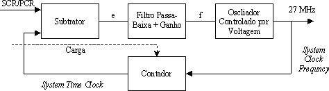 Como mencionado nos parágrafos anteriores, para atingir o objetivo de recuperação do sinal VBRc, basta recuperar a freqüência_do_relógio_do_sistema, para então satisfazer a Equação ( 1 ), através dos outros parâmetros obtidos do próprio fluxo de transporte. Na Figura 5 pode-se ver que esta solução acrescenta mais um relógio no sistema, o relógio STCa. O relógio do decodificador, STCd , é automaticamente sincronizado ao relógio STCa, por exigência de construção do padrão. Resta somente então, a sincronização entre o relógio do codificador e o relógio STCa.