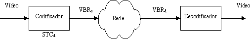 A Figura 4 ilustra o que acontece com o fluxo MPEG gerado pelo codificador até o momento em que ele chega no decodificador, atravessando a rede. O codificador MPEG gera um fluxo VBR controlado (VBRc), ou seja, a taxa do fluxo é variável, mas com variação controlada por alguns parâmetros funcionais, conforme foi exposto na seção anterior. Após a passagem pela rede, este fluxo passa a ser VBR descontrolado (VBRd).