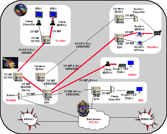 O ambiente de teste de transmissão de vídeo tem sido a rede REMAV Rio, estendida pela perna que liga o Laboratório TeleMídia da PUC-Rio à TV Globo, através de uma fibra a 622 Mbps. Para uma apresentação do ambiente, achou-se por bem apresentar o experimento realizado durante o Congresso da SBC 1999, interligando diversos pontos do campus da PUC-Rio, a REMAV Rio e a TV Globo.