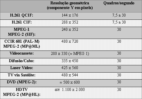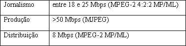 Um vídeo de qualidade de TV deve apresentar uma resolução espacial de, no mínimo, 320x240 e resolução temporal de 30 quadros por segundo. Desta feita, a taxa gerada por um vídeo com estas características já é bastante alta, mesmo empregando-se uma codificação para o vídeo bastante eficiente. A tabela abaixo mostra algumas das taxas de vídeo comprimido geradas.