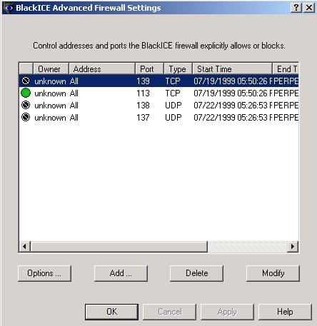 As opções avançadas de configuração permitem que se criem regras específicas com as seguintes opções: endereços IP específicos; todos endereços IPs; portas específicas; todas as portas; tipo de protocolo; regra de aceitação ou rejeição; e tempo de duração da regra. Com isto, é possível criar regras por períodos determinados, atrelados a algum ataque específico.