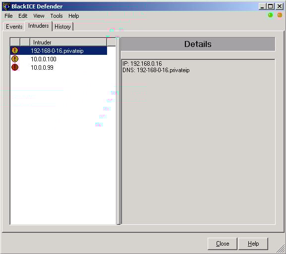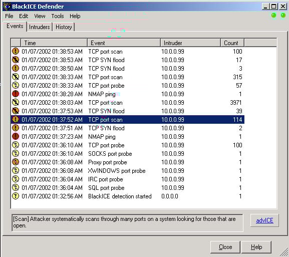 A principal tela do BlackIce mostra uma relação de ataques sofridos explicando, em detalhes, o tipo de ataque envolvido. É possível notar que as informações fornecidas estão mais próximas do que se espera de uma ferramenta de detecção de intrusão - IDS Intrusion Detection System. Ao selecionar um evento, e clicando no botão adICE, serão mostradas informações detalhadas no site da NetworkICE.