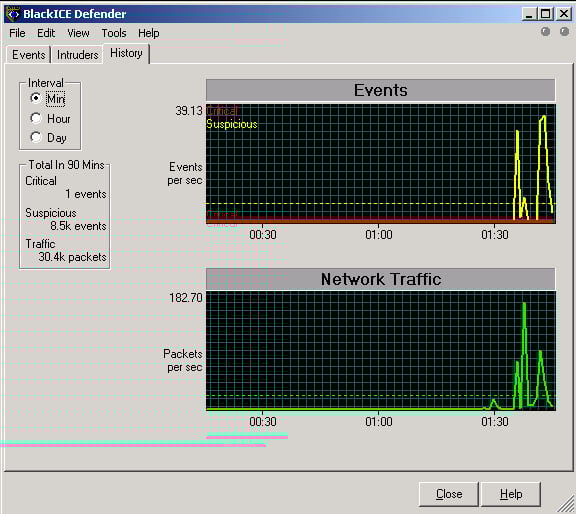 A janela History mostra dois gráficos: um relacionado aos eventos que ocorreram e outro referente ao tráfego de pacotes. Estas informações são interessantes de se analisar após um certo período de tempo, onde fica facilmente visível se algum ataque ocorre com alguma periodicidade ou se algum ataque com grande volume de pacotes ocorre.