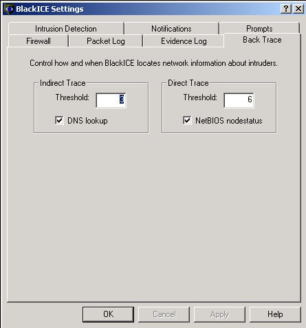 A opção Back Trace é utilizada para obter informações adicionais dos IPs que aparecem na lista de Intrusos. Essas opções podem se tornar perigosas, pois permitem ao atacante saber que ele foi identificado pelo software. A utilização destas opções deve ser considerada como indesejável, pois qualquer informação adicional pode ser obtida de outras formas.