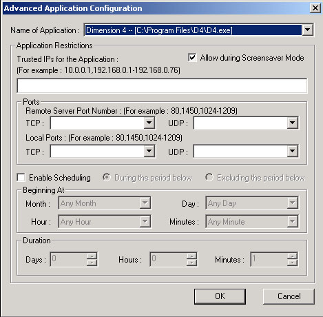 Ao selecionar uma aplicação, é possível entrar em modo avançado, que permite uma configuração mais complexa. É interessante verificar que é possível desabilitar individualmente os acessos durante o modo de proteção de tela (screensaver). Outras opções interessantes são limitar o acesso a uma lista de IPs, estipular portas de acesso e configurar os períodos que a aplicação pode acessar a rede.