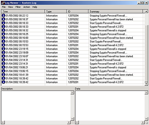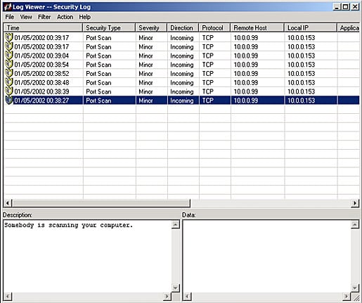 Os logs de segurança mostram todos os acessos que foram negados. Uma mensagem com o tipo de alerta é também enviada para o console do Sygate (tela principal). Ao se selecionar uma entrada particular, é possível obter uma descrição sobre o ataque que ocorreu.