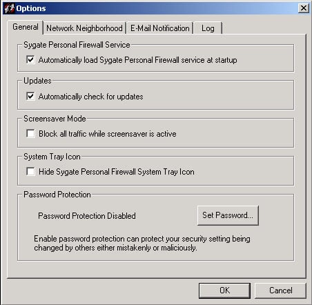 As opções de configuração estão disponíveis através do menu tools. Nas opções gerais, é possível desabilitar todo o acesso durante o descanso de tela (screensaver). As opções de inicialização automática e verificação de updates devem estar selecionadas. É possível, ainda, proteger com senha a configuração do firewall.