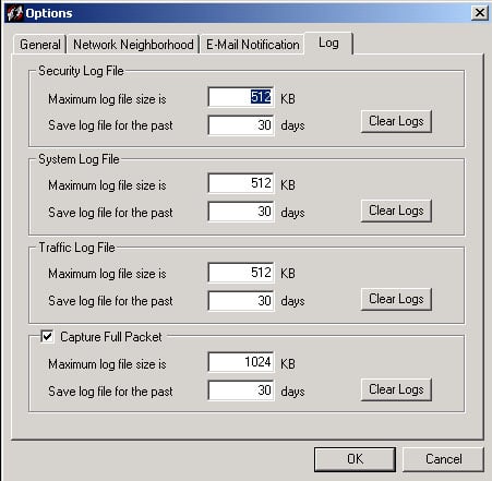 A opção de configuração de logs permite que sejam configurados os tamanhos máximos dos arquivos de logs e por qual período as informações serão armazenadas. Para que seja possível estudar os pacotes suspeitos é necessário habilitar a opção "capture full packet".