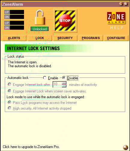 O Painel Lock trata do travamento automático da conexão internet. A utilização desta opção aumenta o nível de segurança, pois permite que o computador seja desconectado da rede durante períodos de inatividade ou durante a proteção de tela. Apesar de ser interessante, deve-se tomar cuidado com esta opção, pois em caso de acionamento de qualquer conexão externa, por exemplo um download, será interrompido.