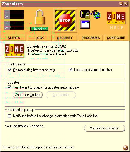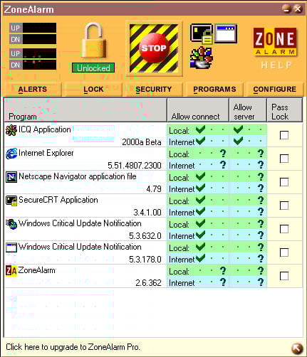 Versão disponível em janeiro/2002: ZoneAlarm v2.6.362
