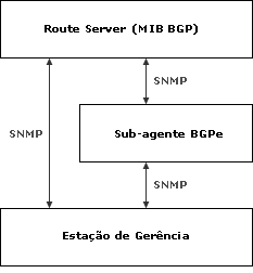 Analisando as fontes de informação e as necessidades listadas anteriormente, verifica-se que a MIB-BGP não fornece tais informações de forma direta. Entretanto, através da MIB BGP é possível obter todos os anúncios e atributos da tabela BGP, além do estado de cada sessão BGP. Baseado nessas informações, seria necessário processá-las para obter as informações desejadas. Surge então a necessidade de um sub-agente que faça acesso da MIB-BGP nos Route Servers e forneça via SNMP as informações desejadas, fazendo o processamento necessário. O sub-agente foi chamado de BGPe.