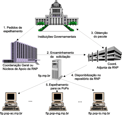 - Após um parecer favorável desta coordenação, as informações que devem ser espelhadas são colocadas numa máquina central, a ftp.rnp.br, a partir do diretório /pub/RNP;