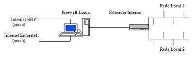 Considerando a seguinte situação: O roteador Linux tem três interfaces de rede, sendo uma na rede comercial, uma na rede acadêmica, e uma na rede privada, para acesso das redes privadas internas. Suponha que a instituição queira separar tráfego de acordo com a rede, ou seja, a Rede1 acessa a Internet pela RNP e a Rede2 acessa Internet pela Embratel. Tal problema pode ser facilmente resolvido, usando o sistema de roteamento por origem descrito acima, combinado com algum sistema de NAT (Network Address Translation). O roteador com suporte a NAT troca o endereço de rede pelo próprio, e, internamente, guarda uma tabela para mapear o endereço original no retorno do pacote. No exemplo, será utilizado o IP Masquerading, já existente no Linux, pela sua facilidade e sua eficácia já comprovada. Repare que sem um NAT, teríamos problemas de roteamento no retorno do pacote, pois cada provedor (Embratel ou RNP) possui seu próprio bloco de endereçamento IP. Para facilitar, iremos atribuir IPs fictícios para cada elemento da rede: