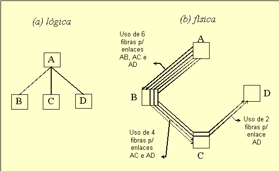 - O cabeamento físico deveria ser superdimensionado, proporcionando uma capacidade sobressalente de transmissão. A motivação para o provimento desta capacidade abundante de transmissão foi de tornar mais flexível o aproveitamento da rede óptica, com a criação de circuitos redundantes através da concatenação de enlaces (ver Figura 3), e para atender também a outras aplicações, tais como telefonia e TV a cabo. Adicionalmente, o custo marginal de mais um par de fibras no mesmo cabo cai vertiginosamente, uma vez que a maior parte dos custos do cabeamento não depende criticamente do número de fibras no cabo;