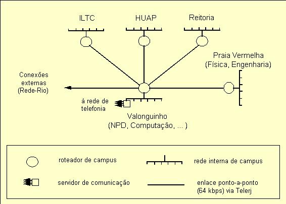 Em 1994, a conexão externa da UFF à Internet (via a Rede-Rio da Faperj) era uma linha de 64 Kbps (quilobits por segundo) da antiga Telerj entre o Núcleo de Processamento de Dados (NPD) no campus do Valonguinho e o backbone da Rede-Rio no Laboratório Nacional de Computação Científico (LNCC/CNPq) no bairro da Urca, na cidade vizinha do Rio de Janeiro. Este enlace foi instalado em 1992 pela Faperj, que custeava seu aluguel, e, até o início de 1999, ele ainda existia, embora a administração da outra ponta tenha passado para o Centro Brasileiro de Pesquisas Físicas (CBPF/CNPq), no mesmo local. Até abril de 1998, esta linha servia a todos os usuários da universidade, e estava muito congestionada por causa do crescimento da demanda.