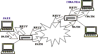 Na ilustração acima (Figura 1), suponhamos que a máquina jazz.empresa1.com.br deseje fazer uma comunicação de voz através da Internet (voz sobre IP) com a máquina ciranda.empresa2.com.br. Esta aplicação requer baixo atraso e baixa variação do atraso (jitter) para que sejam mantidos os requisitos de qualidade. Então, jazz envia uma mensagem especificando as características para o tráfego (path) para ciranda. Quando a mensagem de path chega a ciranda, inicia-se o procedimento de reserva de recursos (resv) por todo caminho entre este dois nós da rede. Todos os roteadores entre os dois pontos passam pelo processo de alocação de recursos e qualquer um deles pode rejeitar a solicitação, informando para jazz que a solicitação não foi aceita. Caso todos os roteadores tenham condições de disponibilizar os recursos solicitados, é alocada a largura de banda e buffer necessários para a aplicação.